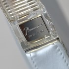 A pair of modern chromium plated metal and Baccarat glass mounted side chairs, designed by Philippe Starck, upholstered in silver leather, height 90cm, width 41cm, depth 50cm (chip to corner of glass top rail).