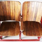 A pair of 20th century wrought iron and slatted wood folding cinema style chairs, height 78cm, width 96cm, depth 58cm.