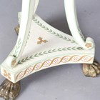 A pair of early 20th century Neoclassical Revival painted torchère stands, the tops inset with rouge marble, the stands painted with palmettes, masks and stiff leaf bands, on cast gilt metal claw feet, height 77.5cm, diameter 36cm.