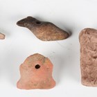 A small group of pre-Columbian artefacts, including a pottery mould, a stone pendant and a stamp.