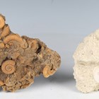 A fossilized formation of multiple ammonites, width 29cm, together with a formation of three Scutella sand dollars, width 22.5cm.