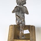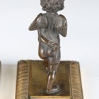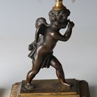 A pair of 19th century brown patinated and gilt bronze figural table lustre candlesticks, each cut glass sconce hung with glass drops and supported on Cupid supports, height 23cm (one sconce detached). Provenance: from the estate of the late Michael Rawlins of Wakefords, Easebourne, West Sussex.