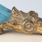 A pair of 19th century gilt metal mounted blue glass cornucopia table vases, each ram's mask terminal on a white marble plinth, height 19.5cm. Provenance: from the estate of the late Michael Rawlins of Wakefords, Easebourne, West Sussex.