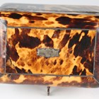 An early 19th century tortoiseshell tea caddy with metal stringing, raised on ivory ball feet, width 13cm. Note: a non-transferrable ivory exemption certificate has been granted for the sale of this item.