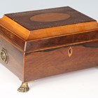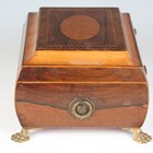 A Regency rosewood workbox of sarcophagus form, the hinged lid with oval satin birch reserve within a satinwood band, raised on gilt metal claw feet, width 25cm.