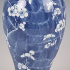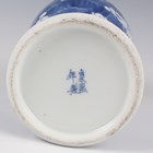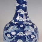 A Chinese blue and white porcelain bottle vase, mark of Kangxi but late 19th century, painted with dragons and vapours, underglaze blue four-character mark to base, height 24.8cm (chip to footrim), together with a similar blue and white baluster vase, painted with blossoming prunus branches, underglaze blue four-character mark to base, height 25.5cm.