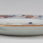 A Chinese famille rose export porcelain plate, Yongzheng period, painted with figures crossing a bridge to a mountainside pavilion, diameter 22.5cm (hairline crack to rim), together with three Chinese Imari export porcelain plates, 18th century, painted and gilt with flowers, diameters 22cm and 22.6cm (minor glaze fritting/chips to rims), and a Yongzheng style famille rose porcelain plate, diameter 23.7cm (hairline crack to rim).
