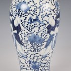 A Chinese blue and white porcelain vase, mark of Kangxi but late 19th century, of baluster form, painted with opposing pairs of boys flanking large vases amidst blossoming prunus, underglaze blue four-character mark to base, height 31.5cm (drilled hole near to base and restoration to neck).