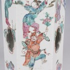 A Chinese famille rose porcelain hat stand vase, late Qing dynasty, of hexagonal form with six pierced quatrelobed apertures, painted with figures and precious objects, unmarked, height 27.5cm.
