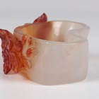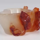 A Chinese two-tone agate brushwasher, probably late Qing dynasty, the grey stone body carved in relief with russet blossoming prunus, length 7.8cm, height 3.2cm (minor chips), together with a Chinese two-tone agate pebble snuff bottle and stopper, the grey stone body carved in relief with iron red/russet bat, branch and flowers, length 7.2cm.