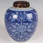 A Chinese blue and white porcelain ginger jar, late Qing dynasty, of ovoid form, painted with flowers and foliage, height 15cm, with carved and pierced wood cover.