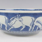 A Chinese blue and white porcelain circular bowl, Kangxi style but late 19th century, the interior painted with a dragon roundel beneath a rim of Long Elizas and fence, the exterior with the eight horses of Muwang, underglaze blue mark to base, height 8.4cm, diameter 24cm.