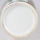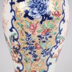 A pair of Chinese Canton famille rose porcelain vases, mid to late19th century, each of tapered cylindrical form with flared neck, typically painted with figures, birds and flowers, applied with gilt chilong to shoulders and Buddhistic lion handles to neck, height 25cm (rim restoration to one), together with a Chinese famille rose export porcelain baluster vase, Qianlong period, painted with figural panels, height 18cm (cracked and repaired).