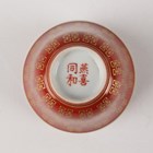 A pair of Chinese gilt decorated iron red ground porcelain wine cups, probably 20th century or later, each of steep-sided 'U' form, the exterior decorated with four rows of gilt characters, iron red enamelled four-character mark to bases, height 4.9cm.