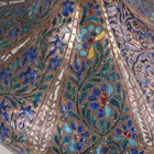 A Kashmiri champlevé enamelled and engraved gilt copper surahi bottle and stopper, late 19th century, the squat globular body, narrow neck and domed cover decorated with vertical floral panels of turquoise, blue, yellow, white and green flowers and leaves, height 28.5cm.