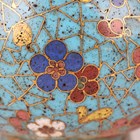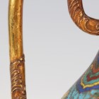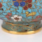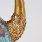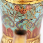 A Chinese cloisonné enamel and gilt copper ewer, mark and period of Qianlong, the pear-form body decorated with blue, red, yellow, white and pink prunus on a 'cracked ice' turquoise ground, the neck with further prunus above a stiff leaf collar and band of ruyi heads, the gilt domed cover with Buddhistic lion knop finial, flanked by a gilt chimera mouth scroll spout and foliate capped scroll handle, incised four-character mark within double square to base, height 18.5cm. Note: for a similar Qianlong mark and period ewer with Buddhistic lion finial, see Lot 542, 'Imperial Pursuits: Treasures from the Palace Workshops' sale, 2nd May 2005, Sotheby's Hong Kong.