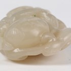 A group of four Chinese carved pale celadon jade pendants, late Qing dynasty and later, including one carved as a boy, height 5cm, another carved and pierced with a figure on horseback, length 5cm, and another in the form of two lingzhi fungi, length 5.8cm, together with a Chinese celadon jade elephant carving, length 4.5cm.