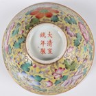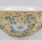 A Chinese famille rose enamelled yellow ground porcelain bowl, mark of Xuantong and possibly of the period, of circular form with slightly flared rim, the exterior painted with flowers, leaves and scrolling tendrils on a yellow ground, iron red six-character mark to base, height 4.4cm, diameter 9.2cm.