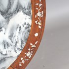 A Chinese hardwood tip-top wine table, late 19th century, the circular top inset with a black, grey and white marble panel within a surround of inlaid mother-of-pearl flowers, the baluster column on tripod cabriole legs with claw and ball feet, diameter of circular top 83cm.