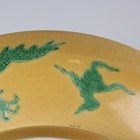 A Chinese Ming style yellow and green glazed circular dish, mark of Zhengde but later, the interior decorated in anhua with three scattered vapours, the yellow ground underside with a pair of incised green dragons, flaming pearls and vapours, underglaze blue four-character mark within double ring to base, diameter 23cm (minor hairline and firing fault to rim).
