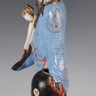 A Chinese enamelled porcelain figure of a gentleman, early 20th century, modelled standing beside a black wine pot, holding a gilt cup, impressed seal mark to base, height 21cm, together with three Chinese export porcelain blue and white shallow bowls, Qianlong period, with gilt monogrammed shield shaped pendant panels, diameters 15.9cm x 18cm, a famille rose export porcelain coffee cup, painted with a figural scene, height 6.6cm, a small group of Canton famille rose teaware and two yellow glazed porcelain beakers (some faults).