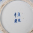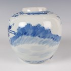 A Chinese blue and white porcelain ovoid ginger jar, late 19th century, painted with blossoming prunus branches, height 14cm, together with two further blue and white ginger jars, painted with figures, heights 12.7cm and 13cm, and three green glazed porcelain circular brush washers, diameters 8.5cm and 7.7cm.