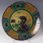A Japanese Ko-Kutani circular dish, Edo period, decorated in yellow, green and aubergine with bird, flowers and rocks, diameter 33.3cm (repaired), together with a Chinese blue and white export porcelain circular dish, Yongzheng period, painted with chrysanthemum and lotus, diameter 34.6cm (broken section of rim). Provenance: purchased from the Prince Littler Estate.