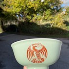A Chinese iron red decorated celadon glazed porcelain circular bowl, mark of Daoguang but later, of steep-sided circular form with slightly flared rim, the interior painted with an iron red fenghuang roundel, the exterior with four further roundels, underglaze blue pseudo seal mark to base, height 6.7cm, diameter 14.8cm.