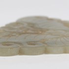 A Chinese pale celadon/white jade plaque pendant, late 19th/20th century, one side carved in low relief with an elephant, the other with a boy within scroll borders, length 6.2cm, together with a carved and pierced celadon jade butterfly pendant, length 7.9cm, and a jade rectangular plaque, carved and pierced with peaches and leaves, length 4cm.