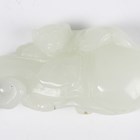 A Chinese pale celadon jade comb of curved form with carved chilong surmount and handle, length 9cm, together with a pale celadon jade pendant, carved in the form of a squirrel and gourd, length 6cm, and a jade hairpin, length 10cm.