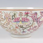 A Chinese famille rose enamelled porcelain bowl, mark of Guangxu and possibly of the period, of hemispherical form, the exterior decorated with a design of four fenghuang divided by lotus and scrolling tendrils, iron red six-character mark to base, height 7.5cm, diameter 14.3cm.