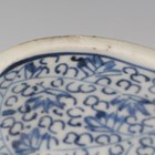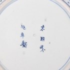 A pair of Japanese Arita blue and white porcelain dishes, Edo period, each painted with a Three Friends of Winter roundel within foliate border, underglaze blue mark of Chenghua to bases, diameter 20cm (one with hairline), together with three Japanese Imari saucers, diameters 12.4cm and 12.6cm.