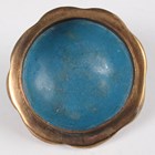 A Chinese cloisonné circular plaque, 20th century, decorated with butterflies and blossoming prunus branches on a blue ground, diameter 30cm, together with a Chinese cloisonné teapot and cover, height 9cm, and a small cloisonné snuff tray, width 9cm.