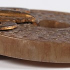 A Chinese archaistic jade bi disc, carved in low relief with a rice grain design, the stone of pale brown and green mottled tone, diameter 8.2cm (cracked), fitted with a gilt metal bat mount.