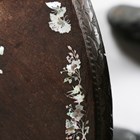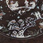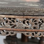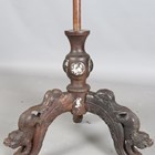 A Chinese hardwood and mother-of-pearl inlaid wine table, late 19th century, the circular top inlaid with mother-of-pearl panels of figures, fish, mythical beasts, birds and flowers, within a carved foliate border, above a birdcage mount and turned baluster stem, the tripod cabriole legs carved with Buddhistic lions and balls, diameter of circular top 74.5cm.