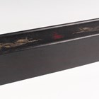 A Chinese zitan table screen and slotted stand, 20th century, the rectangular panel inlaid with hardstone and mother-of-pearl butterfly and flowers beneath lines of incised text, the reverse with further lines of incised green and red text, height 20.3cm, together with a zitan rectangular box, the sliding cover decorated with a pair of dragons and flaming pearl, length 37.8cm.