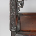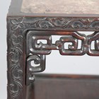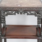 A pair of Chinese hardwood rectangular two-tier stands, late 19th century, each inset with a rouge marble panel above a carved foliate frieze, pierced archaistic scroll apron and panelled undertier on tapering legs and paw feet, height 80.7cm, width 42cm, depth 31.5cm.