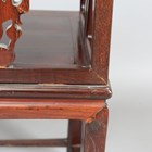 A Chinese hardwood armchair, late 19th/early 20th century, the shaped top rail above a carved and pierced bat, shou medallion, fruiting vine, ruyi and deer splat back, flanked by a pair of scroll arms above a panelled seat on block legs united by stretchers, height 97cm, width 64cm, depth 47cm.