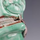 A pair of Chinese famille verte porcelain Buddhistic lion jostick holders, late Qing dynasty, each modelled seated with paw resting on a brocade ball, the rectangular base painted with shou medallions and leaping carp panels, on a trellis ground, height 26cm (restoration).