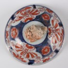 A Japanese Imari porcelain jar and domed cover with Buddhistic lion finial, 18th century, the ovoid body painted with flowers, height 24cm, together with a pair of matching jars, height 16cm.