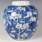 A Chinese blue and white porcelain ginger jar, mark of Kangxi but late 19th century, painted with blossoming prunus branches, underglaze blue four-character mark to base, height 23cm, together with a similarly decorated smaller ginger jar, height 17cm.