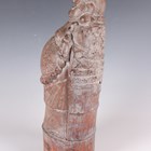 A group of three carved bamboo figures of Buddha, Guanyin and Shoulao, 20th century, heights 35cm and 53cm, together with two carved bamboo models of river boats, lengths 32cm and 33cm.