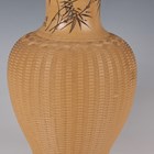 A small group of Chinese Yixing stoneware, mostly 20th century, including a cylindrical teapot, cover and strainer/liner, the exterior impressed with characters, height 10cm, a teapot and cover of canal boat form, length 17cm, a buff coloured vase with wicker design baluster body, height 27.8cm (cracked), and three other teapots and covers (other minor faults).