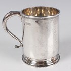 A George V silver christening tankard of tapering cylindrical form with scroll handle, on a circular stepped foot, London 1913 by John Henry Hill, weight 190.4g, height 9cm.