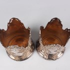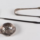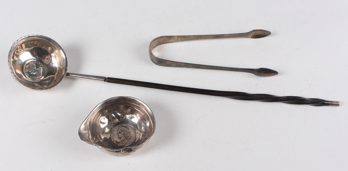 A pair of George III silver Old English pattern sugar tongs, London 1816 by Naphtali Hart, weight 33.3g, a silver toddy ladle, the bowl set with an Anne sixpence 1711, fitted with a twisted whalebone handle, unmarked, another silver toddy ladle bowl (lacking handle), and a group of plated items, including a two-handled tea tray, a pair of wine bottle stands, each cast with fruiting vines, height 13cm, and an entrée dish, liner, cover and handle.