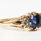 A gold, sapphire and diamond ring, mounted with the cushion shaped sapphire between two principal old cut diamonds, detailed ‘18ct’, weight 4.8g, ring size approx M.