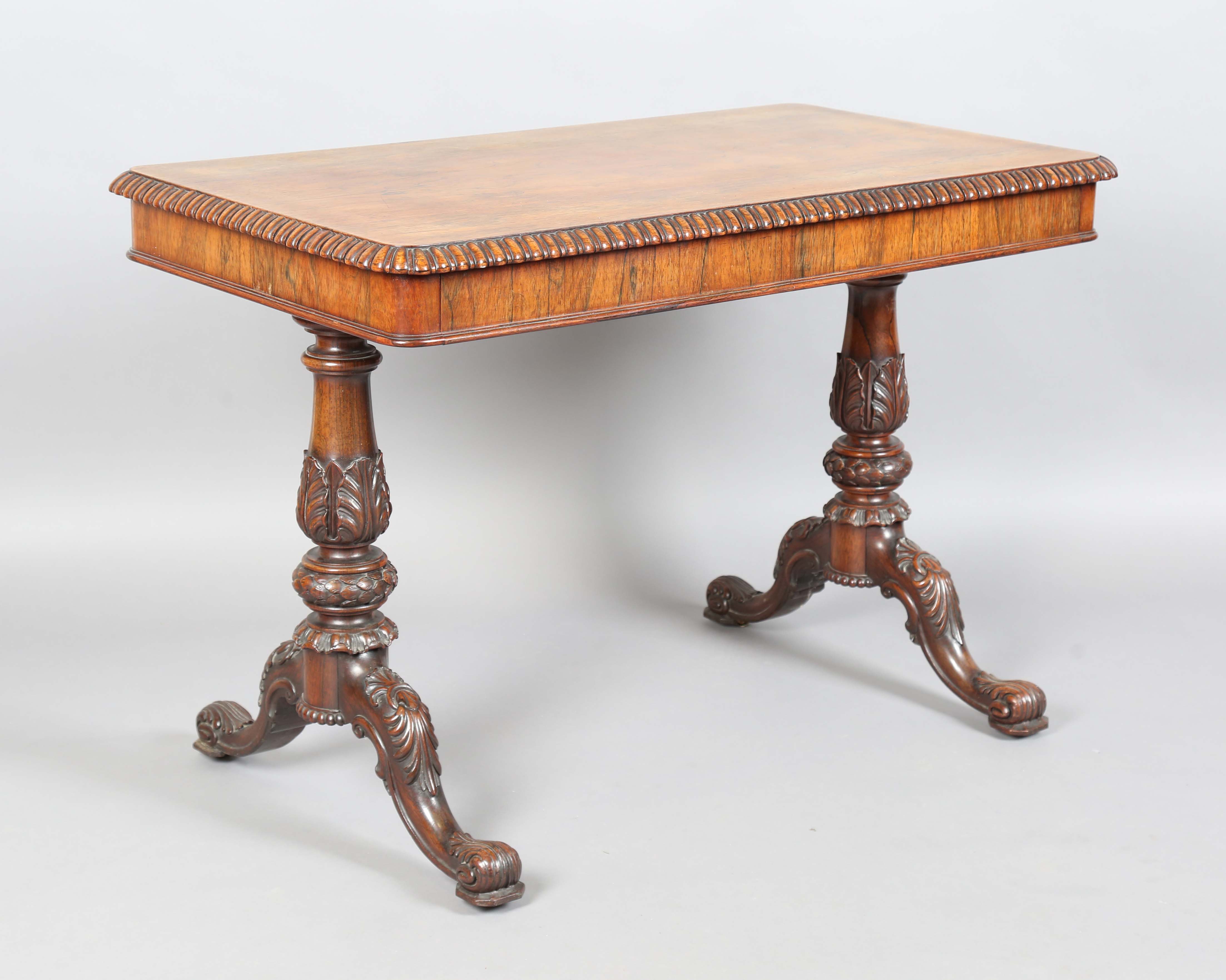 A Regency rosewood rectangular library table, by Gillows of Lancaster, the top with typical bead and reel moulding above two frieze drawers, one bearing maker's stamp, the twin supports carved with acanthus and laurel leaves above foliate carved cabriole legs and castors, height 72cm, width 107cm, depth 60.5cm.