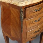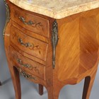 A pair of late 20th century French kingwood and floral marquetry inlaid bedside chests with marble tops and gilt metal mounts, height 76cm, width 43cm, depth 30cm.