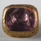 An early 19th century gilt metal and imitation amethyst desk seal, housed within its original case with six interchangeable seal terminals, all with engraved matrices (broken handle), together with three other fob seals.
