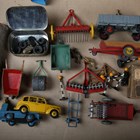 A collection of Dinky Toys cars, commercial vehicles and accessories, including No. 781 petrol pump station 'Esso', boxed, No. 156 Rover 75, three Trojan vans, 'Esso', 'Oxo' and 'Chivers Jellies', Austin wagon and farm implements, together with a Britains Coronation Chair and a Benbros No. 7 electric milk trolley.